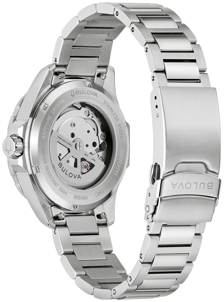 An uncompromising redesign of one of Bulova’s most celebrated models, the new men’s Marine Star Series B watch strikes the perfect balance between form and function. Perfectly sized at 41mm, the stainless steel case features 200M of water resistance, a screw-down crown, and a sapphire crystal, while its new unidirectional bezel has a bi-colour aluminum insert with a timing scale. Complementing the blue and black bezel, the sunray dial shifts from a bright blue center to black, mimicking the gradient of the ocean as it deepens. Bold, luminous hands and hour markers ensure optimal legibility above and below the waves. The watch is paired with a premium H-link bracelet and has a case back crystal to show off the automatic movement with 42 hours of power. Reimagined and better than ever, the new Bulova men’s Marine Star Series B watch is the perfect companion for every adventure, near and far.