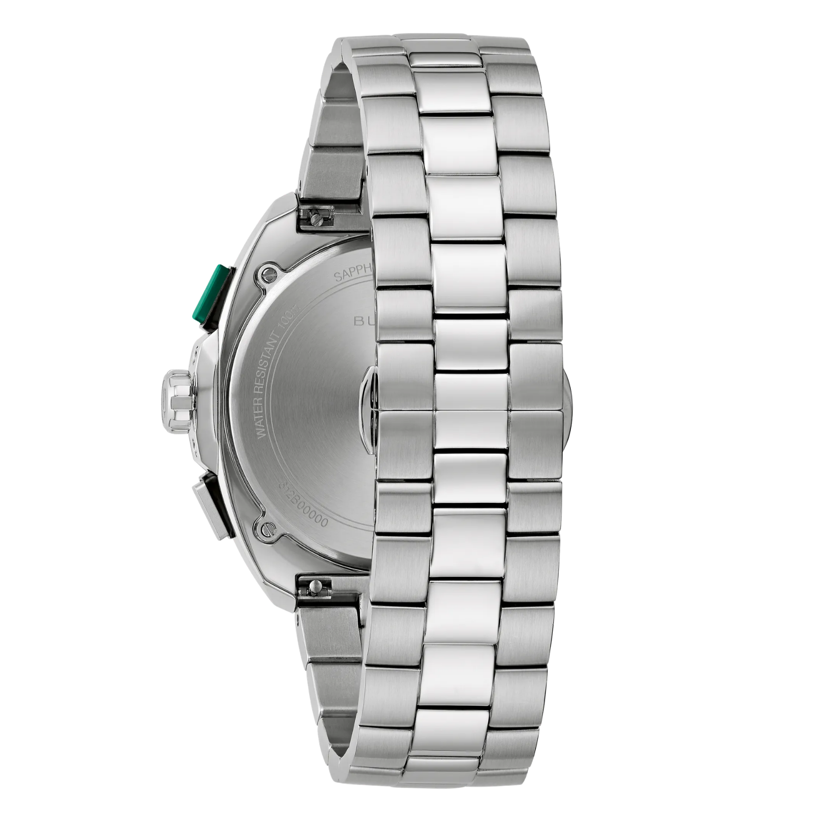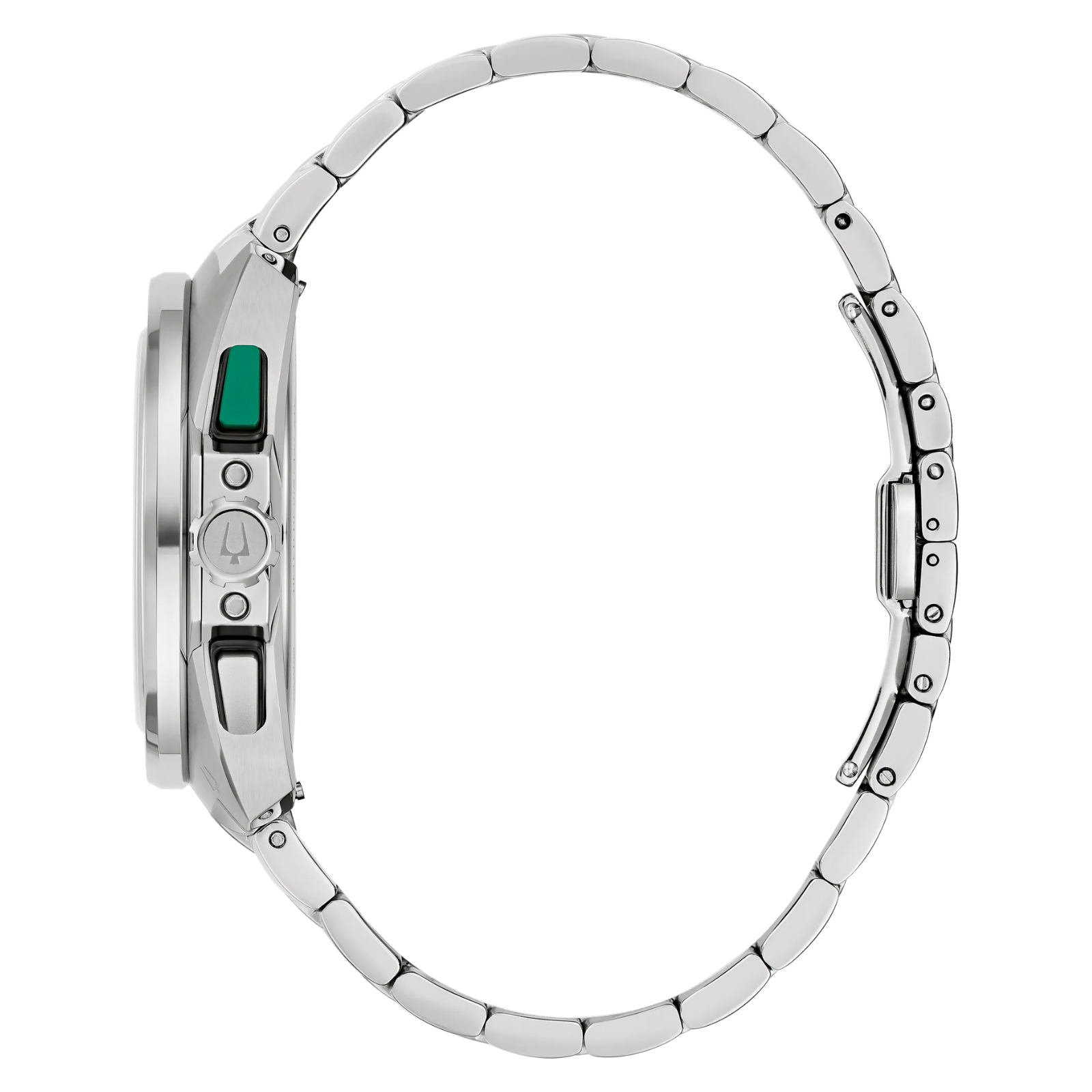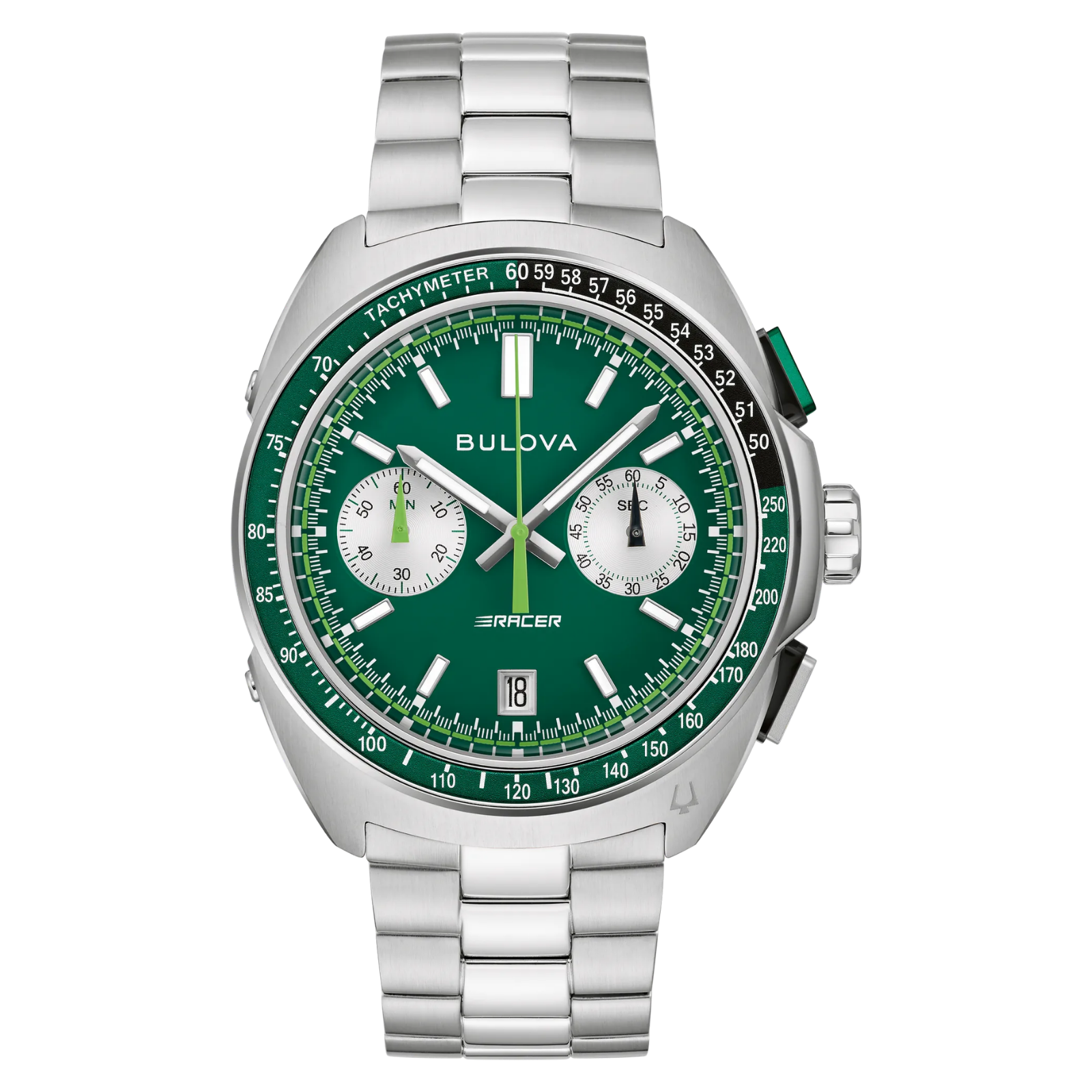 Built on Bulova’s vibrant history in motorsport – from soap box derbies to the upper echelons of auto racing – the men’s 5-hand chronograph Racer watch is fine-tuned and designed for performance. Stainless steel is contoured to create a case featuring a unique design that evokes the aerodynamic curves of the world’s fastest automobiles. A two-tone green and black tachymeter ring offers further functionality, while pronounced pushers provide a distinctively automotive aesthetic. Emphasizing the watch’s motorsport roots, the green dial features a racing pattern chapter ring, with a date display at 6 o’clock and silver subdials displaying the chronograph minutes and the running seconds indicator. A vibrant green chronograph seconds hand ensures optimal legibility, no matter the speed. The dial is appointed with applied silver-tone markers and matching bevelled hands, all filled with bright luminescent material for low-light visibility. The watch is paired with a 3-link stainless-steel bracelet with a deployant clasp for a secure fit. Whether gripping the wheel around the bend at the track or on your daily commute, the Bulova men’s Racer chronograph is a stylish expression of racing history and a passion for speed.