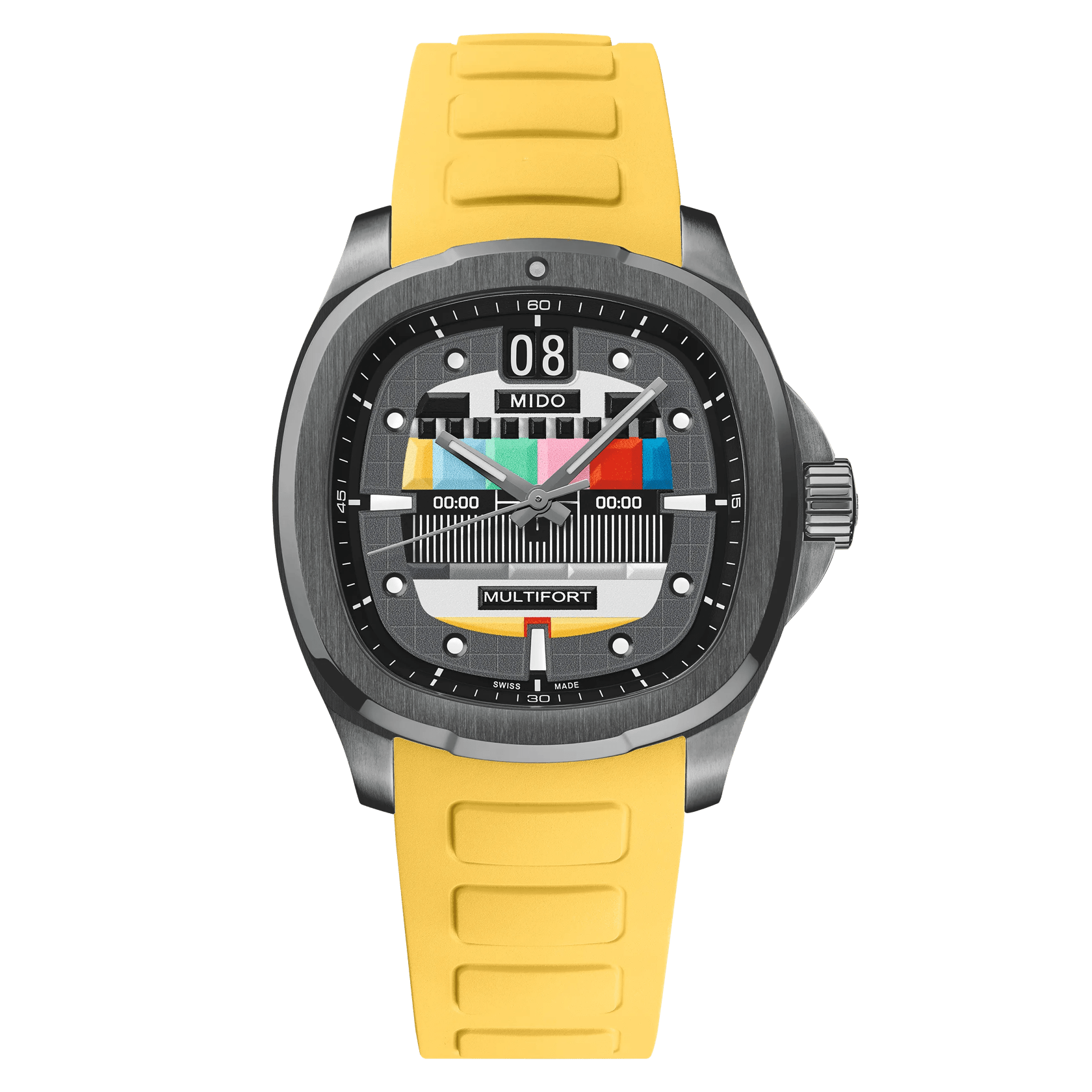 A brilliant flashback! Born from MIDO's extraordinary heritage, the TV-shaped case returns to centre stage for the Multifort TV Big Date, as intense as it is precise, thanks to its formidable mechanical movement. The modern and dynamic design of this Swiss watch is highlighted by a striking dial and, along with its distinctive function: the BIG DATE at 12 o'clock. Its formidable latest-generation automatic movement, Caliber 80, is equipped with a high-tech balance spring in Nivachron™, which offers outstanding resistance to shocks and magnetic fields.