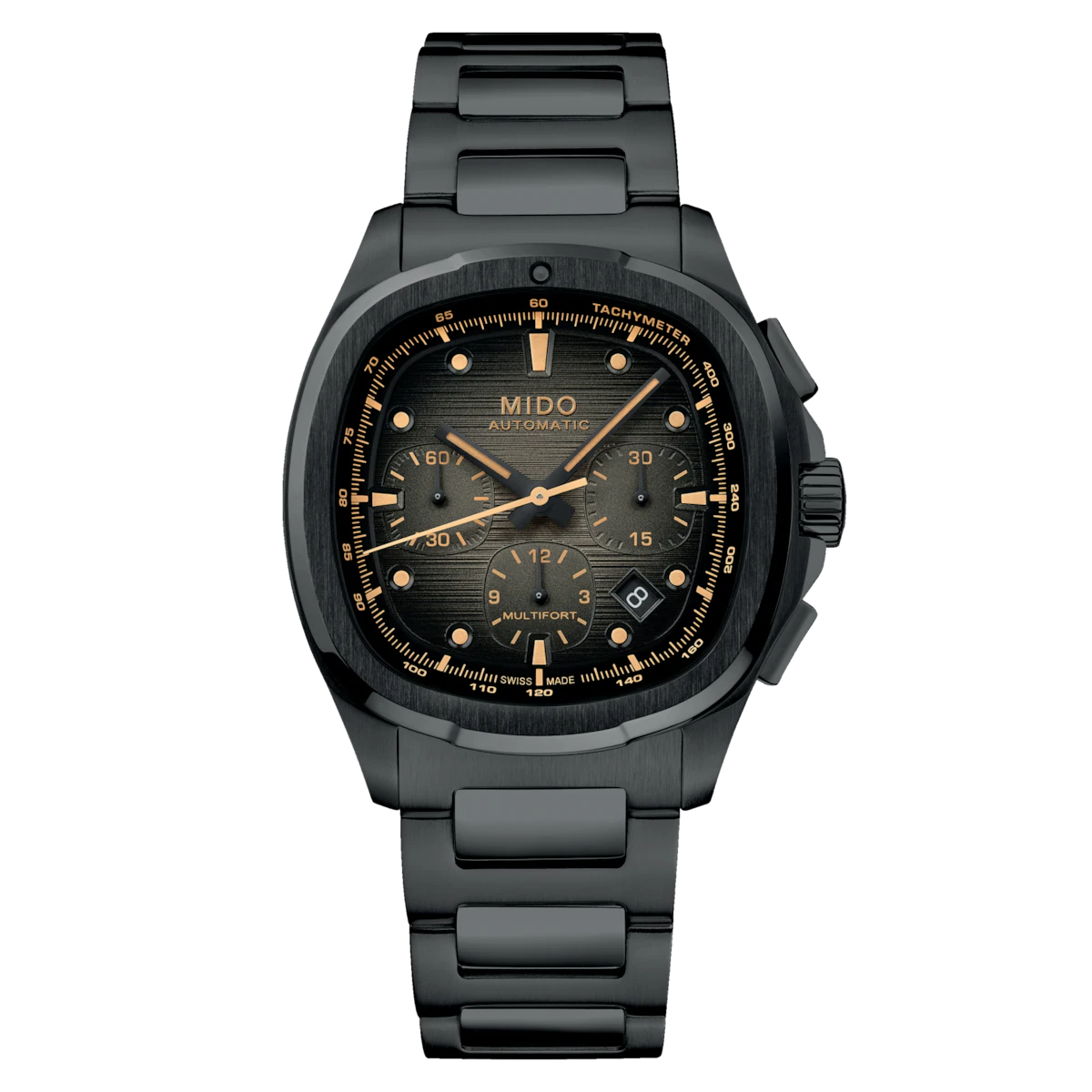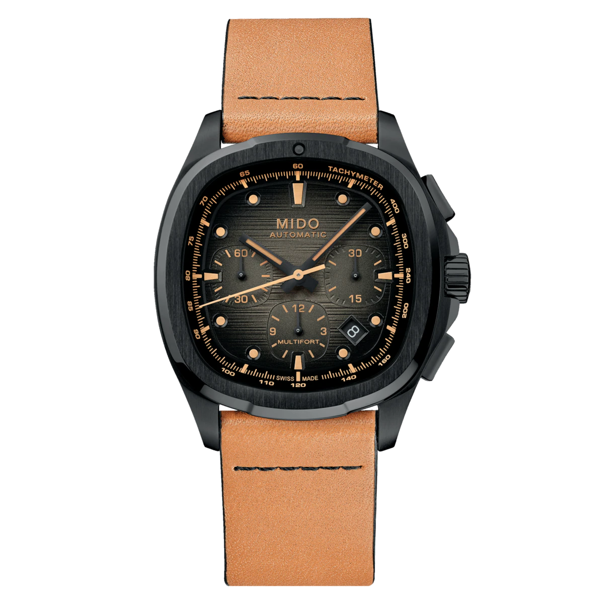 | An eye-catching design! True to MIDO’s bold spirit, the Multifort TV Chronograph asserts its character with a uniquely styled TV-shaped case. Its contemporary silhouette is enhanced by a horizontally brushed dial, brought to life by two subtly integrated counters and contrasting details that highlight its personality. At its core ticks the Caliber 60 – a high-precision Swiss automatic movement – delivering up to 60 hours of power reserve. Technical, expressive, and perfectly balanced, this timepiece is built to accompany every standout moment of daily life. It is delivered with an additional strap, offering even greater versatility and comfort. |