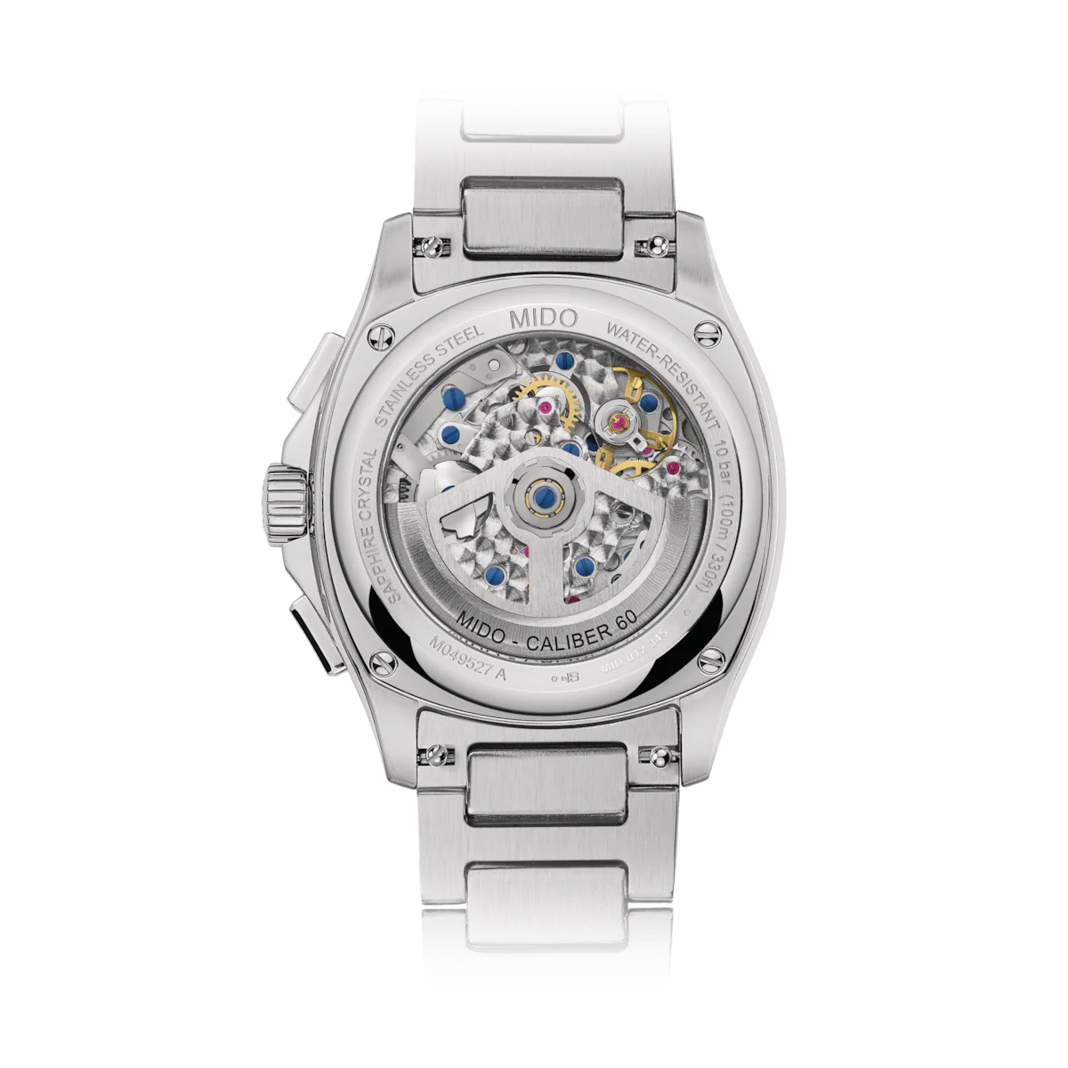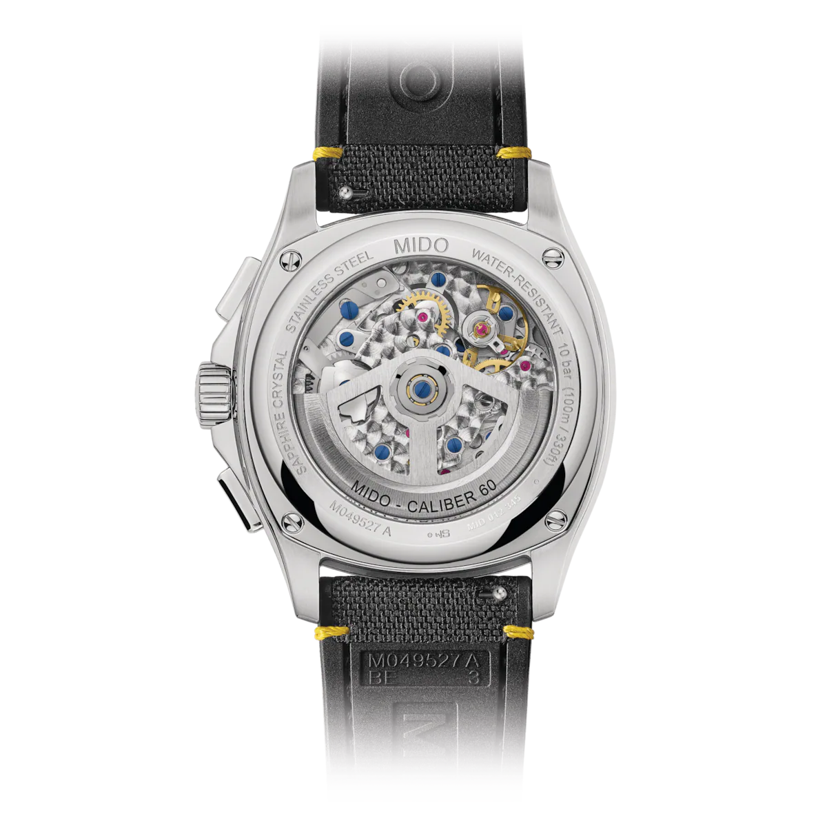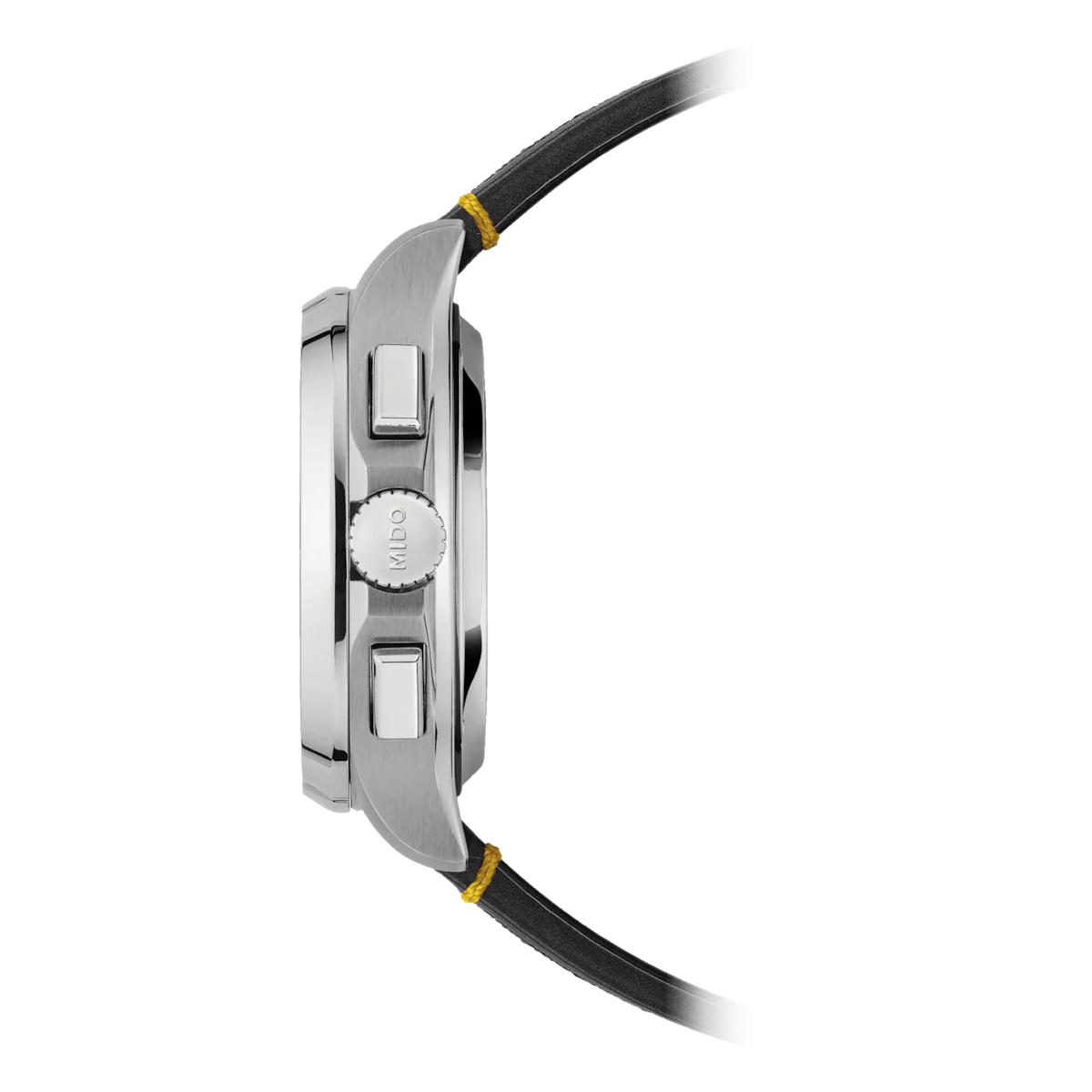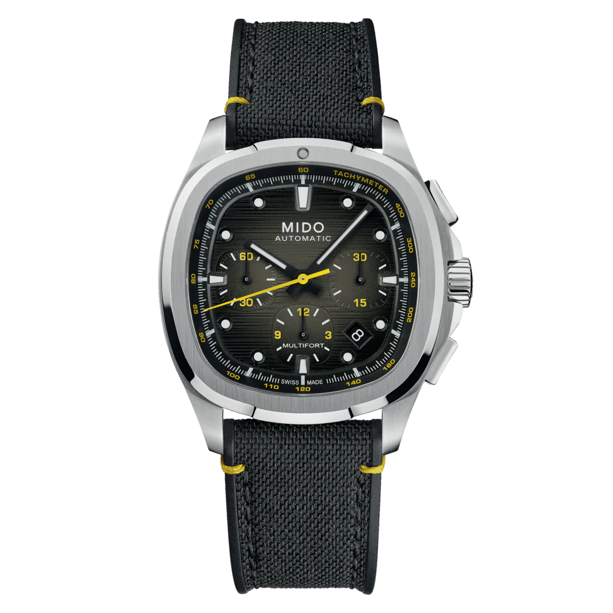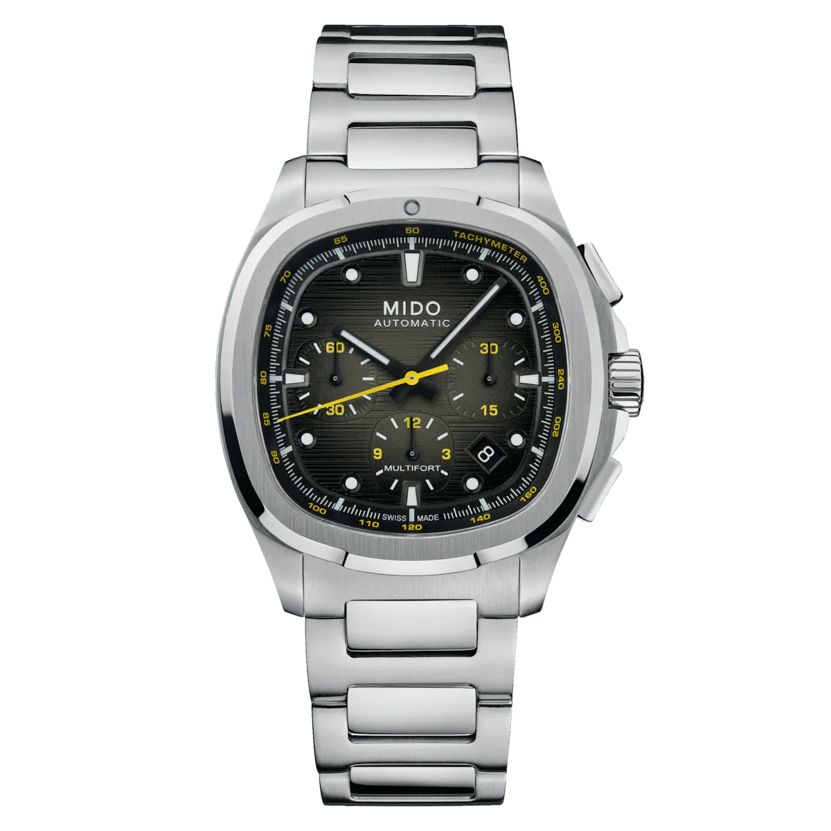 | An eye-catching design! True to MIDO’s bold spirit, the Multifort TV Chronograph asserts its character with a uniquely styled TV-shaped case. Its contemporary silhouette is enhanced by a horizontally brushed dial, brought to life by two subtly integrated counters and contrasting details that highlight its personality. At its core ticks the Caliber 60 – a high-precision Swiss automatic movement – delivering up to 60 hours of power reserve. Technical, expressive, and perfectly balanced, this timepiece is built to accompany every standout moment of daily life. It is delivered with an additional strap, offering even greater versatility and comfort. |