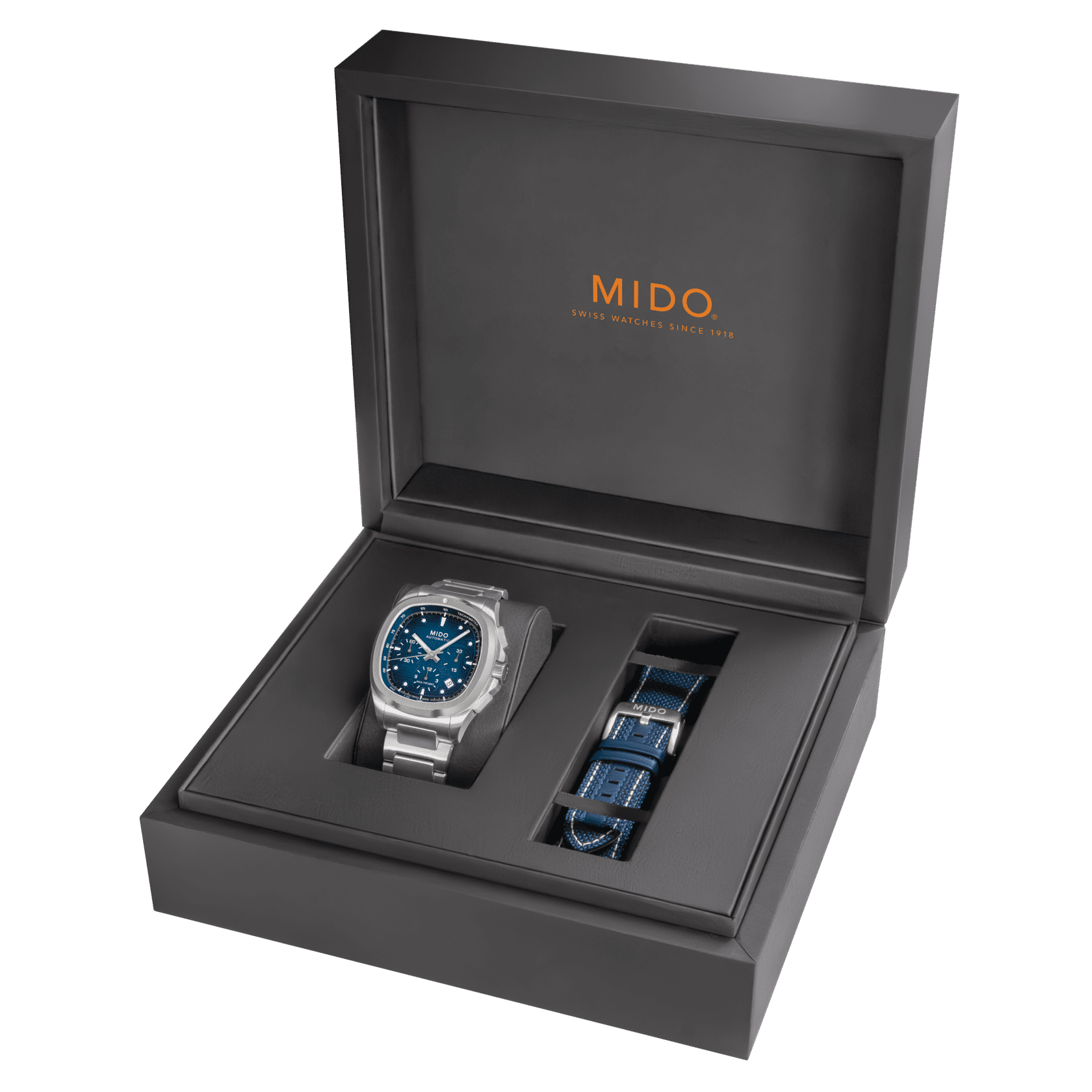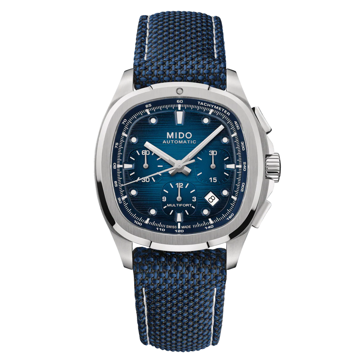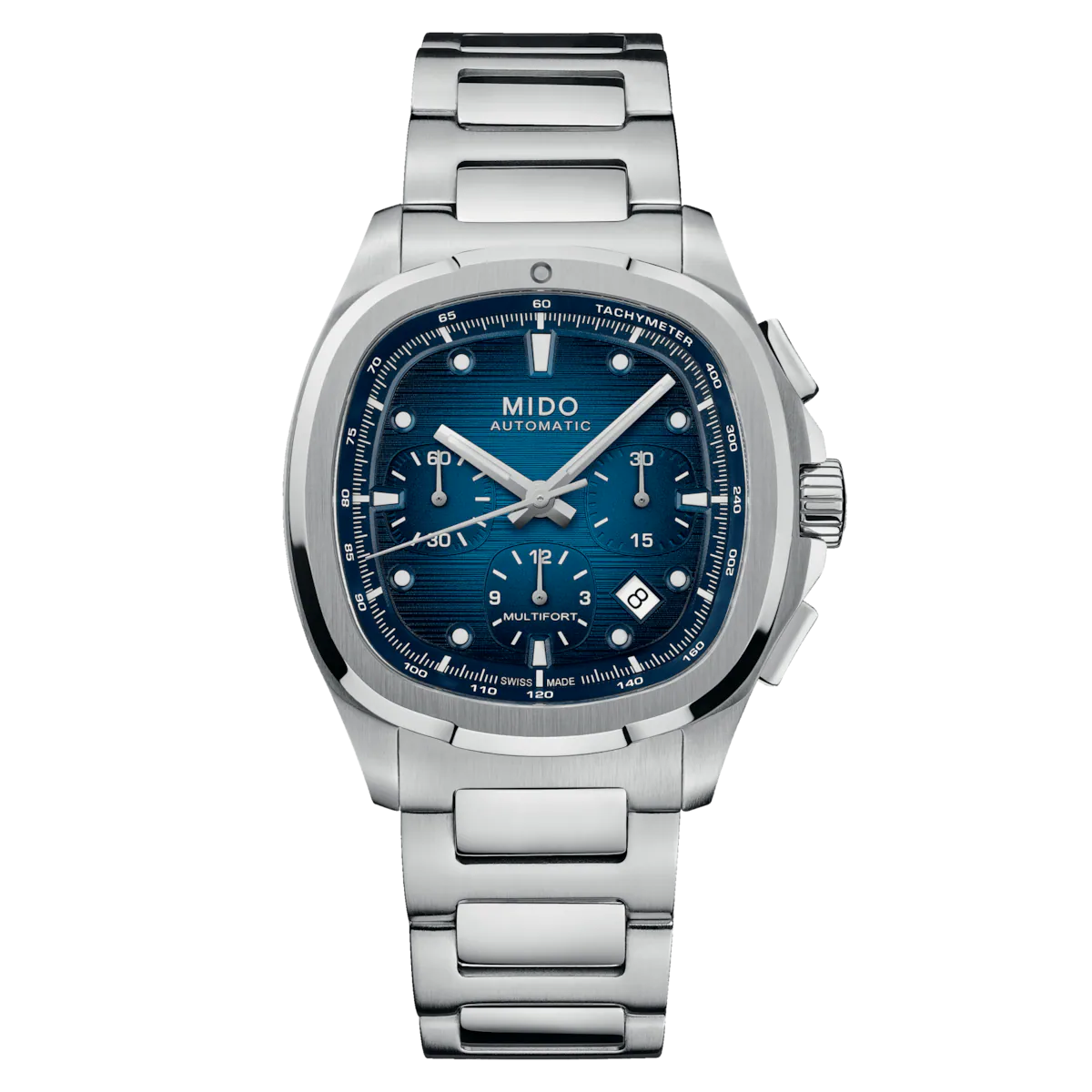 | An eye-catching design! True to MIDO’s bold spirit, the Multifort TV Chronograph asserts its character with a uniquely styled TV-shaped case. Its contemporary silhouette is enhanced by a horizontally brushed dial, brought to life by two subtly integrated counters and contrasting details that highlight its personality. At its core ticks the Caliber 60 – a high-precision Swiss automatic movement – delivering up to 60 hours of power reserve. Technical, expressive, and perfectly balanced, this timepiece is built to accompany every standout moment of daily life. It is delivered with an additional strap, offering even greater versatility and comfort. |