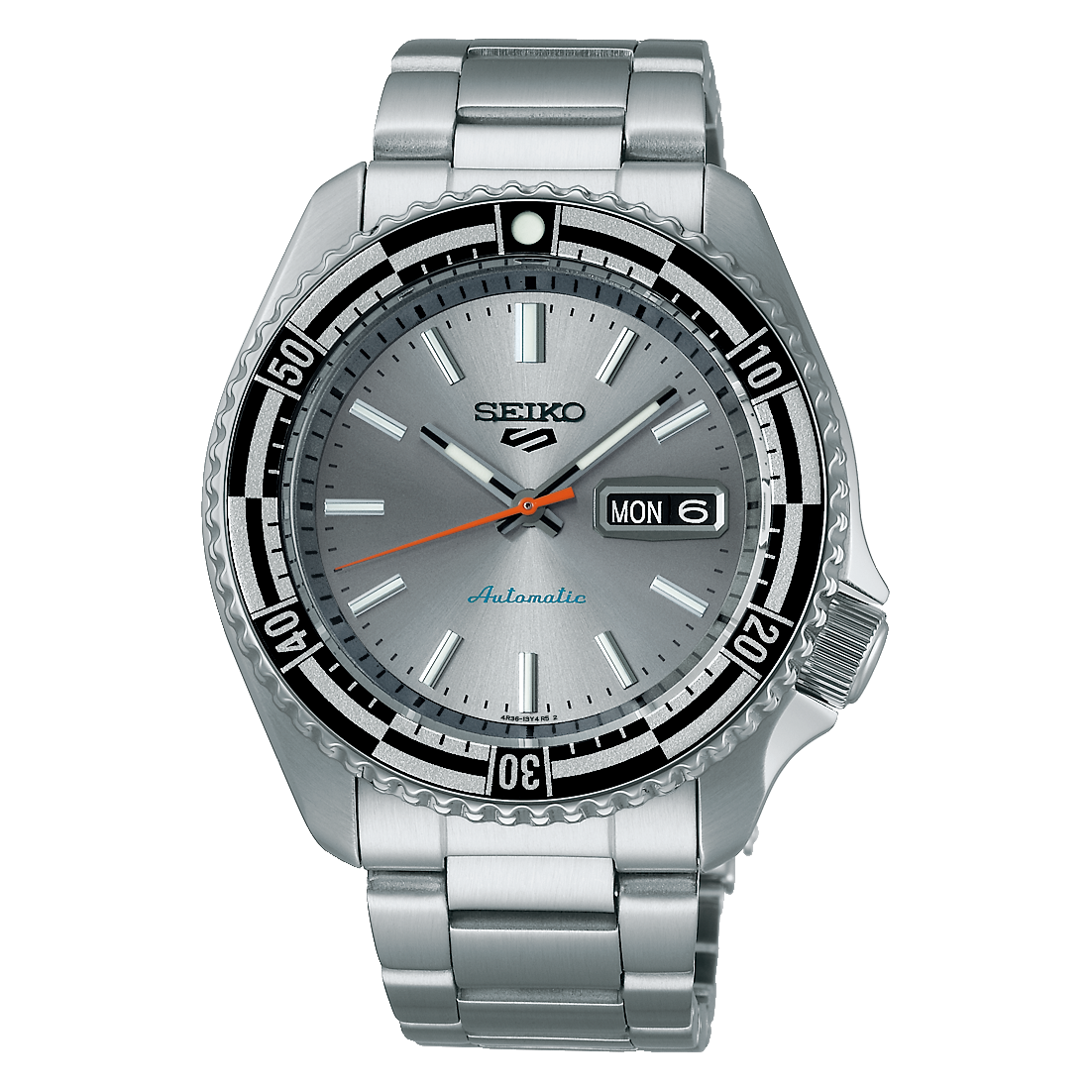 | Dial Color: | Silver with red-orange second hand and checkered bezel | |