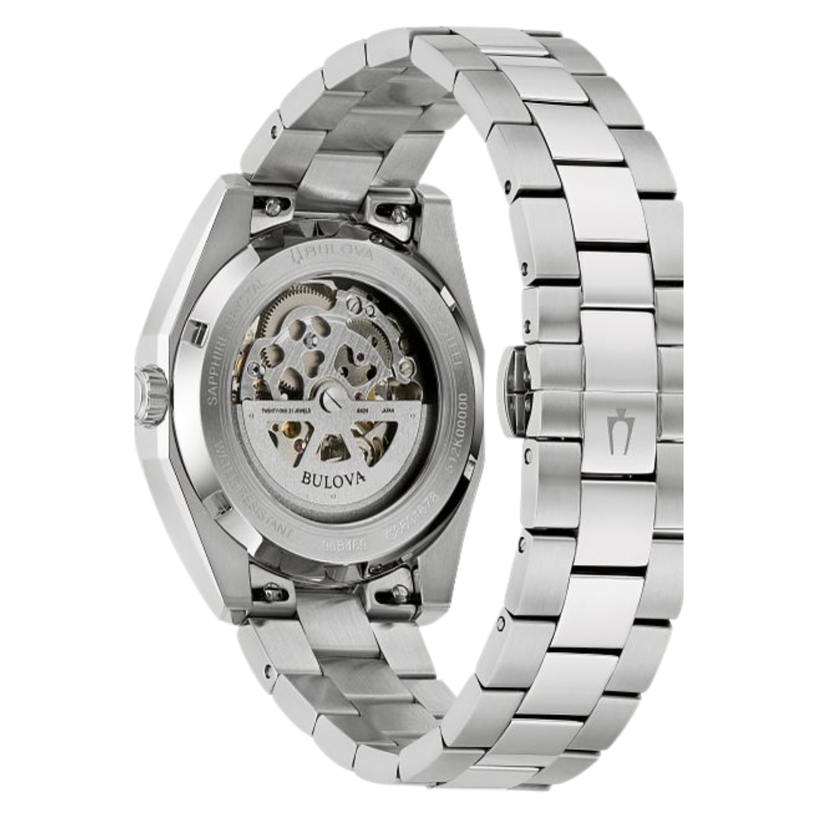 Defined by exceptional quality and sophisticated aesthetics, the Bulova men’s Surveyor is the quintessential modern timepiece. Sculpted edges and faceting distinguish the silver-tone stainless steel case, with polished and brushed finishing, a flat sapphire crystal, and a 3-link stainless steel bracelet with a push-button deployant clasp with easy-release latched spring bars. The radiant light blue dial has a sunburst finish and silver-tone accents, hands with luminescent fill, cutout minute markers, a magnified date display, and a recessed minute track. The watch is powered by an automatic movement with 21-jewels and a 42-hour power reserve, which can be seen through an exhibition window on the case back. For those with a discerning eye for refined luxury, this Bulova men’s timepiece is the obvious choice.