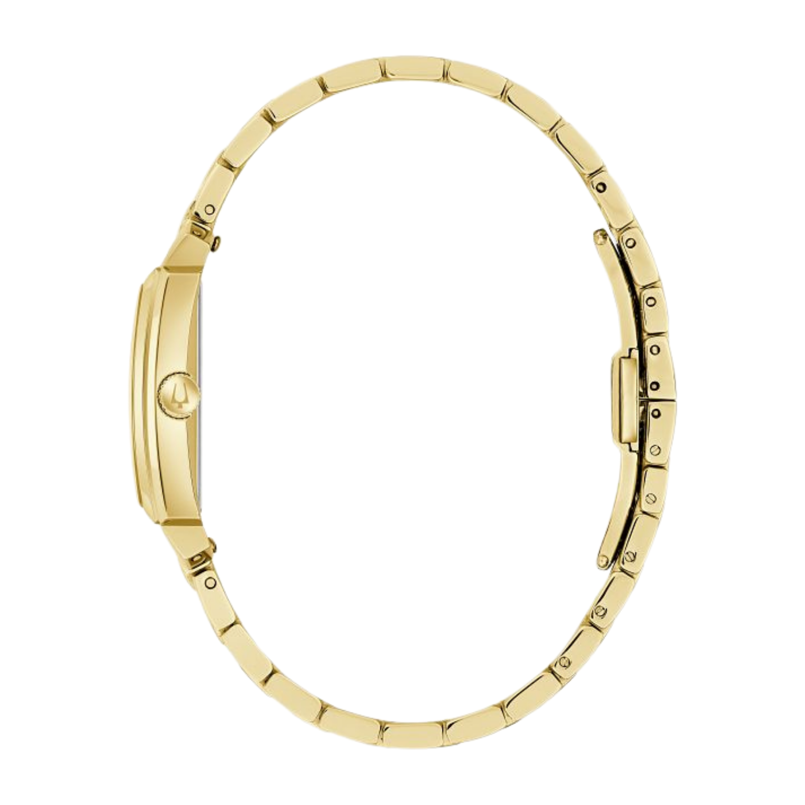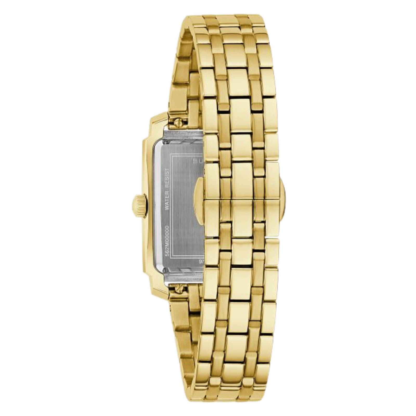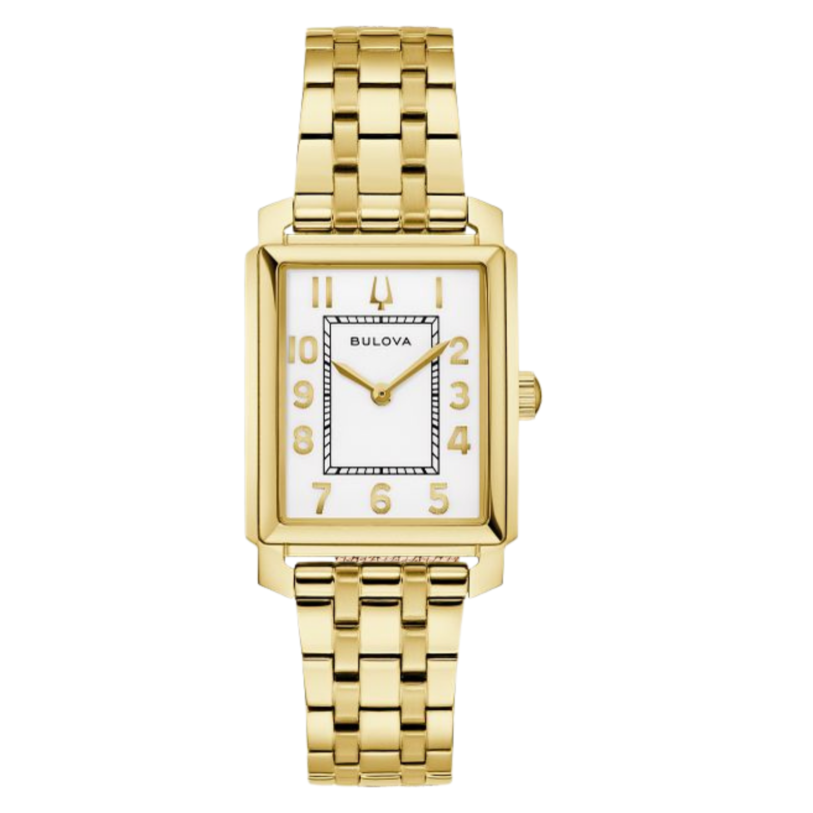 Embrace a refined elegance with this impressive Bulova women’s timepiece from the Sutton collection. Distinguished by a gold-tone stainless steel rectangular case, the watch features a mineral crystal and a finishing that dazzles in the light. The brilliant white enamel dial is accented with applied gold-tone numerals and hands for a look of true sophistication. A matching five-link gold-tone stainless steel bracelet features a deployant closure with pushers for a perfect fit and latched spring bars for easy release. Experience an elevated sense of luxury with this Bulova ladies’ timepiece for the woman with an exceptional sense of style.